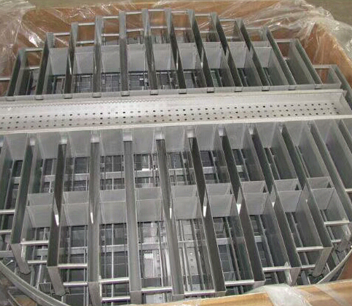 實現(xiàn)傾斜板對全截面的覆蓋,能夠?qū)σ后w收集時提升收集效率,這是柵板式支承-收集-再分布器的最Z大優(yōu)點,但是對于上升氣流的干擾以及高度的增加,會導致其性能受到一定程度的影響。因此,應該采用合理的方式對柵板式支承-收集-再分布器進行改進。柵板支承絲網(wǎng)填料的過程中,液體受到上升氣流的影響,會通過塔壁四周流下。這是由于在網(wǎng)片中存在一定程度的毛細作用,加上上升氣流的上舉力作用,導致液體下落有在困難。為了有效對液體進行收集,需要采取合理的導流措施。為了便于液體分散落入分布槽中,可以將柵板下緣設計為鋸齒狀。液體沿內(nèi)壁流下后通過集液環(huán)由環(huán)形槽收集。多孔型和溢流型柵板式支承-收集-再分布器的設計,能夠分別在小流量和大流量操作中提升工作效率。
